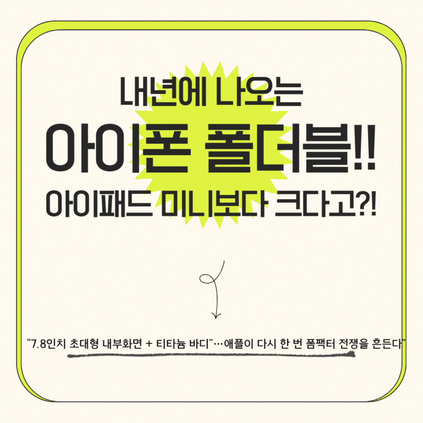- 폴더블 아이폰 내부 화면: 7.8인치 → 멀티태스킹 강화